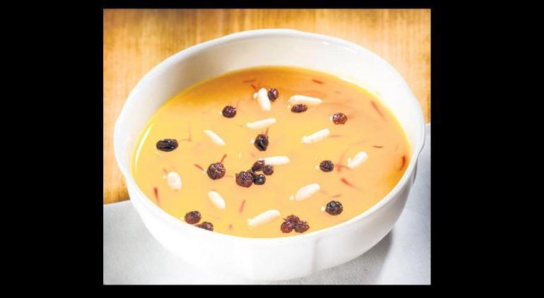 Yapılışı: Safranı gül suyuyla karıştırıp iki saat kadar bekletin. Pirinci yıkayıp iki saat kadar suda ıslatın ve sonra tekrar iyice yıkayıp süzün. Pirinci 10 bardak suda yumuşayıncaya dek 20 dakika kadar haşlayın. Şekeri ekleyin ve 5 dakika kadar daha kaynatın. Safranlı gül suyunu ekleyip kapağı kapalı beş dakika kadar pişirmeye devam edin. En son yarım bardak suda ezdiğiniz ararot veya nişastayı ip gibi akıtarak ekleyin ve sürekli karıştırarak bir taşım daha kaynatın. Kâselere bölün ve gül suyunda beklettiğiniz kuş üzümü ve çam fıstığı ile süsleyin.