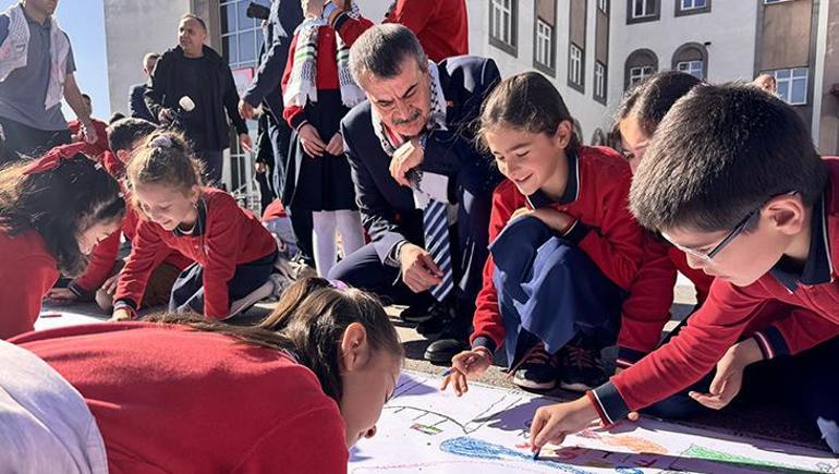 Milli Eğitim Bakanlığınca Türkiye'deki tüm okullarda bugün başlatılan "Filistin Farkındalık Etkinlikleri" kapsamında Ömer Duygun İlkokulu'na gelen Tekin'i, öğrenci ve öğretmeler Filistin atkıları ile karşıladı.