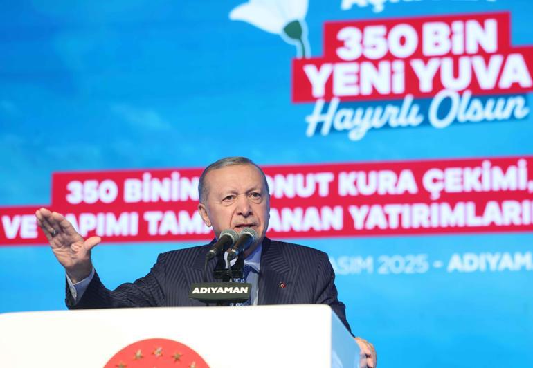 Erdoğan, Adıyaman'da 350 Bininci Afet Konutu Kura Çekimi, Anahtar Teslimi ve Yapımı Tamamlanan Yatırımların Toplu Açılış Töreni'ne katıldı. Burada konuşan Erdoğan, kendisini havalimanından şehir merkezine kadar büyük heyecanla karşılayan Adıyamanlılara teşekkür etti.