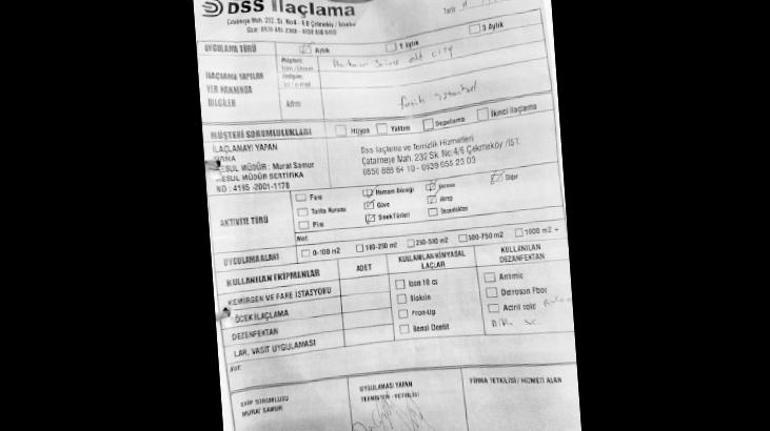 Otelde yapılan ilaçlama işlemine ait fatura ortaya çıktı. İlaçlamanın yapıldığı 11 Kasım’da düzenlenen faturada, aylık olarak hamam böceği, güve, sinek türleri, karınca ve akrepten korunmak için yapıldığı belirtiliyor.