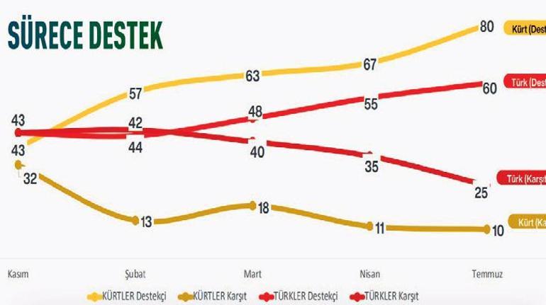 Buna göre Kürtlerde sürece destek üçte bir ile başladı yüzde 80’e kadar geldi. Türklerde destek yüzde 40’ın biraz üzerinde başladı ve yüzde 60’a kadar geldi. Türklerde karşı olanların oranı ise yüzde 43’ten, yüzde 25’e geriledi. Sadece bu çalışma değil, siyasi partilerin elinde de aşağı yukarı buna benzer sonuçlar vardı. Bu noktada sorulması gereken soru şu, eğer gerçekten toplumsal destekte gerileme varsa iki ayda ne oldu?