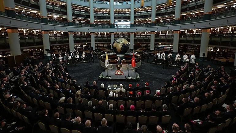 Cumhurbaşkanı Erdoğan ve Papa 14. Leo, ikili görüşmesinin ardından dünyanın en büyük 3. kütüphanesi konumunda olan Cumhurbaşkanlığı Millet Kütüphanesi'ndeki Cihannüma Salonu'nda basın toplantısı düzenledi.