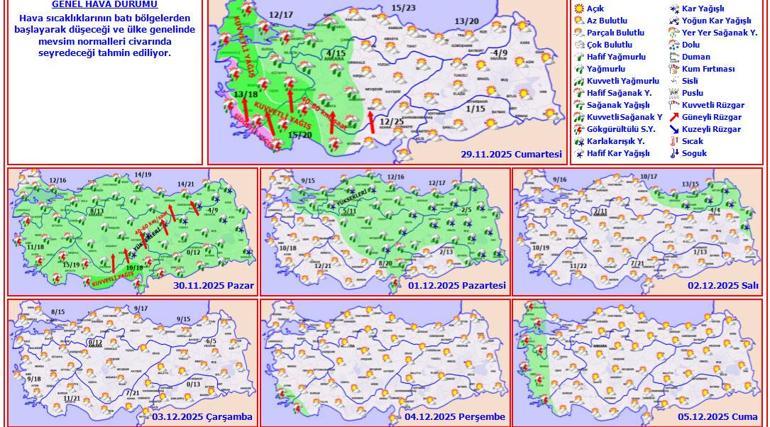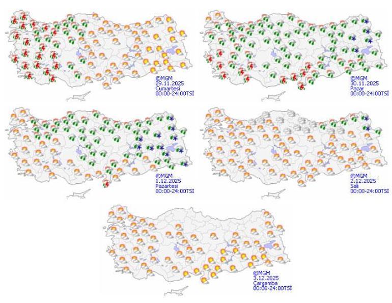 Türkiye genelinde hava sıcaklıkları mevsim normalleri civarına düşerken, özellikle hafta sonu ve sonraki günlerde yağışlı hava etkili olacak. Cumartesi ve Pazar günleri Batı ve Orta Karadeniz bölgesinde kuvvetli yağmur beklenirken, Doğu Anadolu ve İç Anadolu'nun bazı kesimlerinde yer yer kar yağışı görülecek. Pazartesi günü özellikle kuzeydoğu bölgelerde, Doğu Karadeniz ve Doğu Anadolu'nun yüksek kesimlerinde kar yağışı etkisini sürdürecek. Hafta ortasında ise (Salı ve Çarşamba) hava genel olarak parçalı bulutlu ve açık olacak.