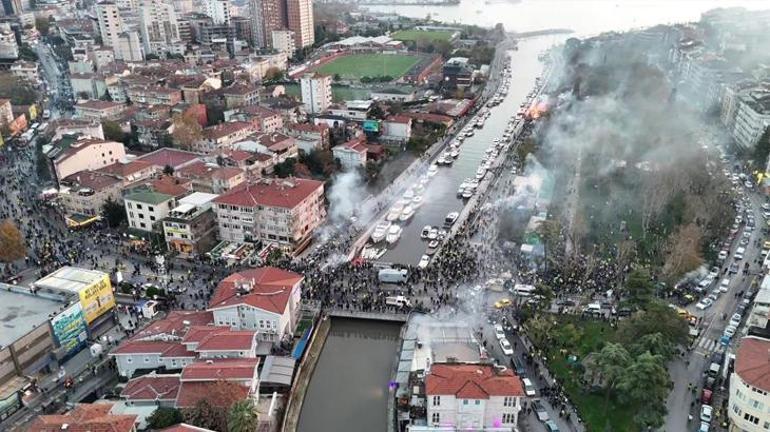 Dron ile görüntülenen yollarda, stada yönelen taraftarlar nedeniyle bazı ana arterlerde araç kuyrukları oluştu.