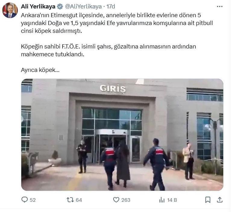 İçişleri Bakanı Ali Yerlikaya da olaya ilişkin sosyal medya hesabından açıklama yaptı. Yerlikaya, "Ankara'nın Etimesgut ilçesinde, anneleriyle birlikte evlerine dönen 5 yaşındaki Doğa ve 1,5 yaşındaki Efe yavrularımıza komşularına ait pitbull cinsi köpek saldırmıştı. Köpeğin sahibi F.T.Ö.E. isimli şahıs, gözaltına alınmasının ardından mahkemece tutuklandı. Ayrıca köpek karantinaya alınmak üzere Etimesgut Belediyesine teslim edilmiştir. Yaralanan Doğa ve Efe yavrularımıza acil şifalar diliyorum" dedi.