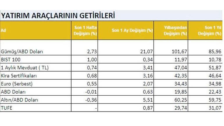 Gümüş haftalık bazda yüzde 2.73 artış sağladı ve yılbaşından bu yana çıkışı yüzde 101.67’ye ulaştı. Böylece 2025’in en güçlü performans sergileyen enstrümanlarından biri olmaya devam ediyor. Altın ons fiyatında bu hafta yüzde 0.36’lık sınırlı bir geri çekilme görülse de yılbaşından bu yana yüzde 60’ı aşan artış, değerli metallere olan ilgiyi canlı tutuyor. Mevduatta haftalık getiri yüzde 0.74, kira sertifikalarında yüzde 0.68 ile yatay seyrin sürdüğünü gösteriyor. Mevduatın aylık getirisi yüzde 3.41.