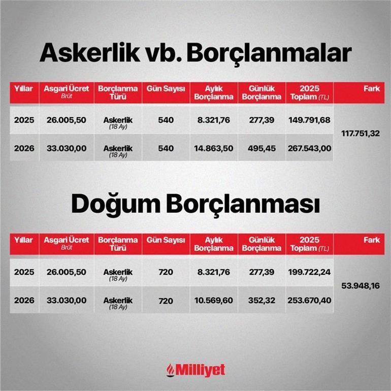 18 ay (540 gün) askerlik borçlanması yapacak bir kişi 31 Aralık 2025’e kadar başvurursa 149.791,68 TL ödeyecektir. Eğer 2026 yılında başvurursa 267.543 TL ödeyecektir. Bu durumda askerlik borçlanmasını 2026 yılına bırakan bir kişi yaklaşık 118.000 TL daha fazla ödeme yapmak zorunda kalacaktır.