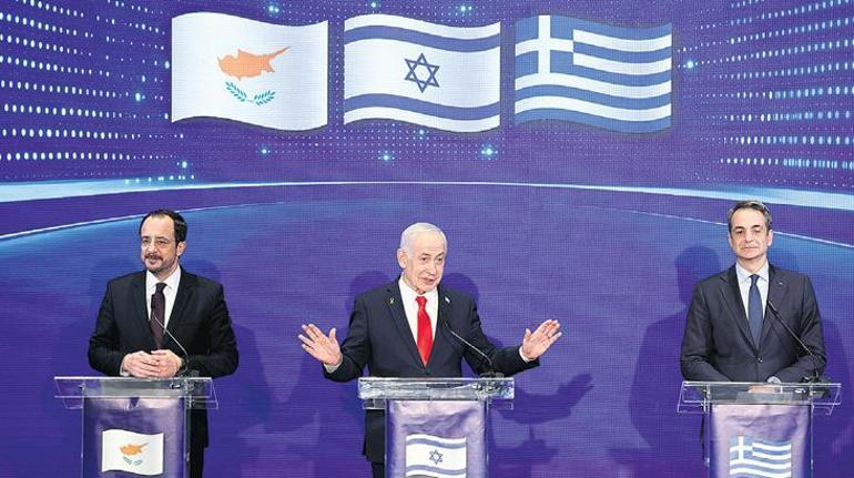 Güney Kıbrıs Rum Kesimilideri Nikos Hristodulidis, İsrail Başbakanı Binyamin NetanyahuveYunanistan Başbakanı Kiryakos Miçotakis