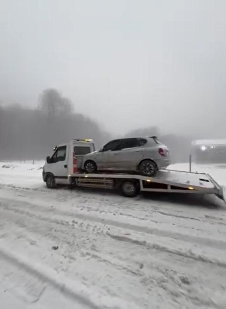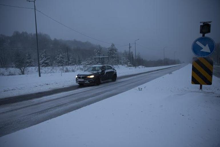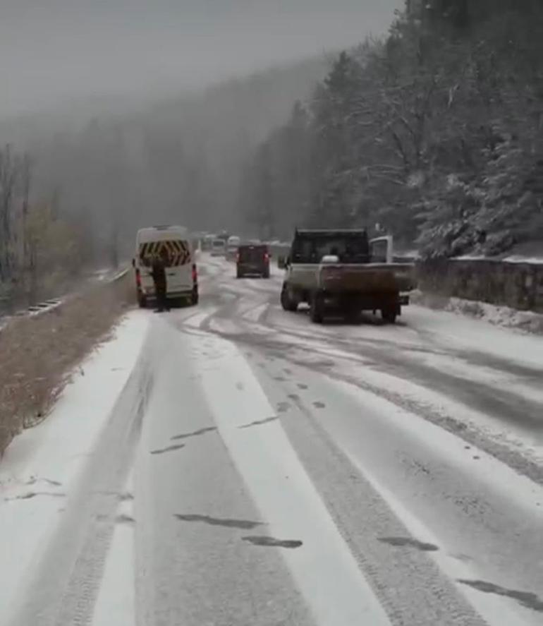 Kar kalınlığının yaklaşık 10 santimetre olduğu güzergahta jandarma ve trafik ekipleri, sürücüleri kış lastiği olmadan yola çıkmamaları konusunda uyarıyor.