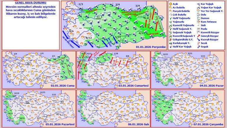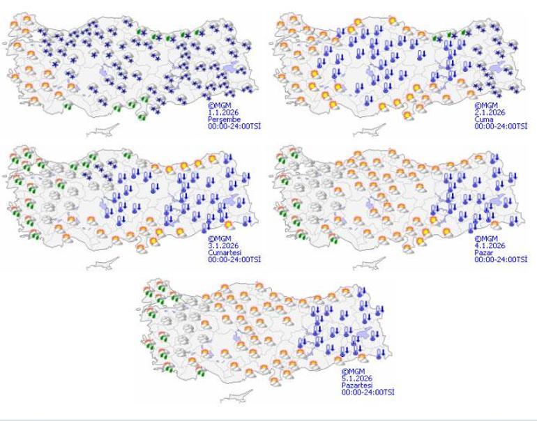 Meteoroloji Genel Müdürlüğü tarafından yapılan tahminlere göre: Ülkemiz genelinin parçalı ve çok bulutlu, Marmara’nın doğusu, Orta ve Doğu Akdeniz, İç Anadolu, Karadeniz, Doğu ve Güneydoğu Anadolu ile Denizli, Kütahya, Afyonkarahisar ve Isparta çevrelerinin aralıklı yağışlı geçeceği tahmin ediliyor. Akdeniz kıyılarında yağmur ve sağanak, diğer yerlerde karla karışık yağmur ve kar şeklinde görülecek yağışların; Doğu Karadeniz kıyıları, Doğu Anadolu’nun güneydoğusu ile Sakarya, Düzce, Zonguldak, Bartın, Ordu, Gümüşhane, Erzincan, Tunceli, Bingöl, Muş, Batman ve Siirt çevrelerinde kuvvetli ve yoğun kar şeklinde olması bekleniyor. İç ve doğu kesimlerinde buzlanma ve don olayı bekleniyor. Doğu Karadeniz’in yüksekleri ile Doğu Anadolu’nun doğusunun yükseklerinin, yüksek kar örtüsüne sahip eğimli kesimlerinde çığ tehlikesi bulunmaktadır.