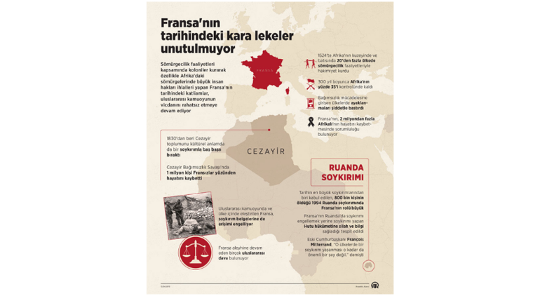 Metinde ayrıca, Fransız sömürgeciliğine atfedilen 30’dan fazla suç sıralanırken, bunlar arasında Sahra bölgesindeki nükleer denemeler ve patlamaların yol açtığı çevresel ve insani tahribat, sivillerin öldürülmesi, uluslararası yasaklı silahların kullanılması ve mayın döşenmesi yer alıyor.