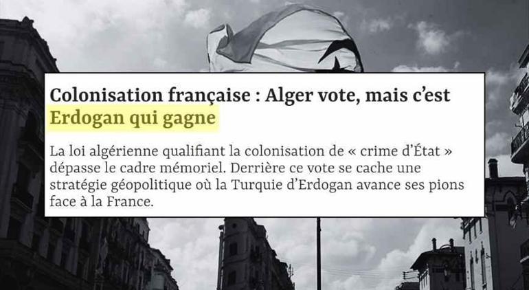 Cezayir Parlamentosu, 24 Aralık 2025’te Fransız sömürgeciliğini 1830-1962 dönemi için “devlet suçu” ilan eden yasayı oybirliğiyle kabul etti. Dergi, bu haberi Fransız sömürgeciliğini suç kabul eden yasa için oy kullandı ve 'Cumhurbaşkanı Erdoğan kazandı' ifadeleriyle duyurdu.