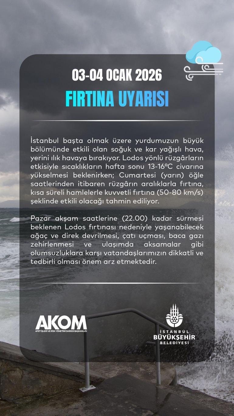 İstanbul'da yarın öğle saatlerinden itibaren etkili olması beklenen lodos fırtınası nedeniyle ağaç ve direk devrilmesi, çatı uçması ve baca gazı zehirlenmesi gibi olumsuzluklara karşı dikkatli olunması istendi.