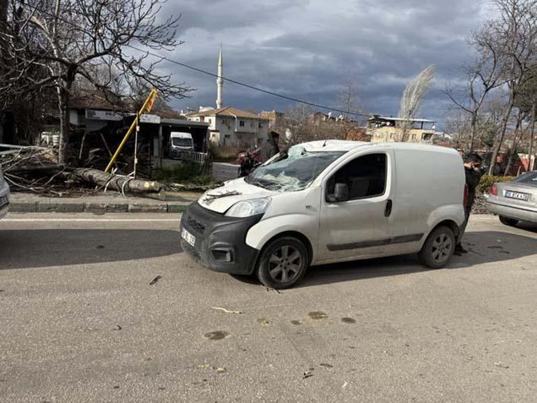 Osmangazi ilçesi Atıcılar Mahallesi'nde seyir halindeki 16 BIL 235 plakalı hafif ticari aracın üzerine rüzgar nedeniyle kökünden sökülen ağaç devrildi.