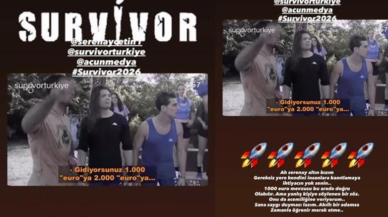 Survivor şampiyonlarından Kılıççı, Instagram'dan yayımladığı mesajda; ''Ah Seren ay altın kızım. Gereksiz yere kendini insanlara kanıtlamaya ihtiyacın yok senin. 1000 euro mevzusu bu arada doğru olabilir. Ama yanlış kişiye söylenen bir söz. Onu da acemiliğine veriyorum.. Sana saygı duyması lazım. Akıllı bir adamsa zamanla öğrenir merak etme..'' ifadelerini kullandı.