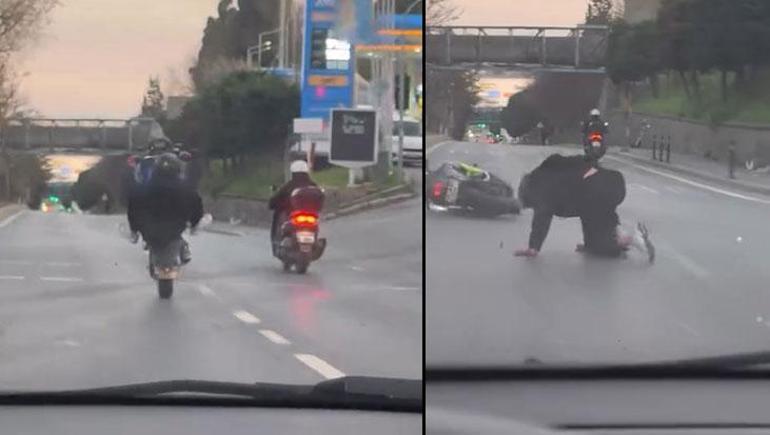 Üsküdar'da trafik ışıklarında bekleyen motosiklet sürücüsü ışığın yeşil yanmasıyla motosikletinin önünü havaya kaldırdı. Direksiyon hakimiyetini kaybeden sürücü yola savruldu.