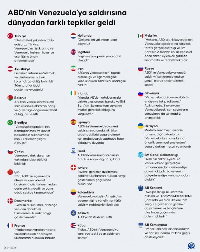 Operasyonun Latin Amerika genelinde endişeyle karşılandığı, bazı ülkelerde ABD’nin askeri müdahalelere yeniden yönelebileceği kaygısının dile getirildiği bildiriliyor. Küba ve Nikaragua gibi Venezuela’ya yakın ülkelerin ekonomik ve siyasi olarak zor durumda kalabileceği belirtiliyor.