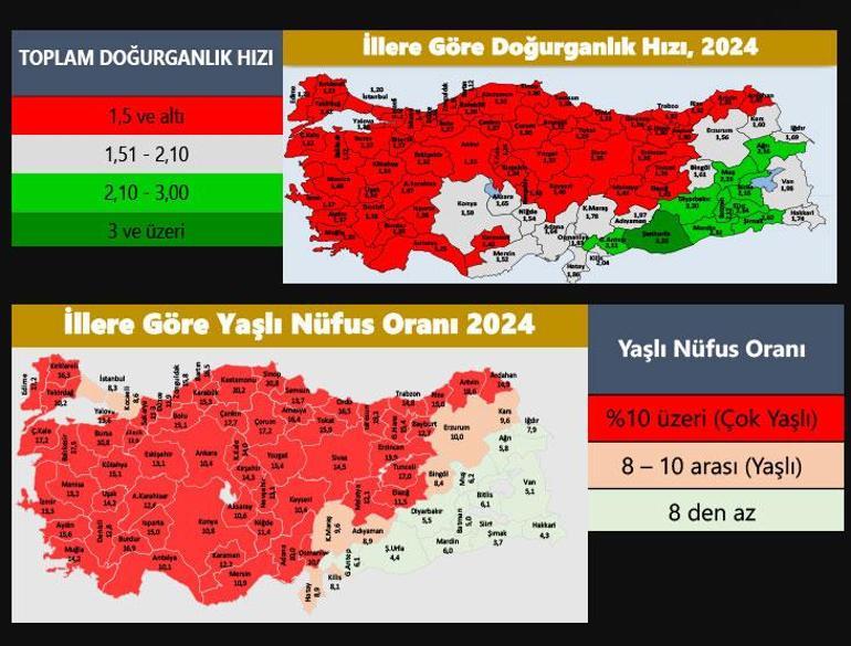 Bakan Göktaş’ın verdiği bilgiye göre, 2007’de “çok yaşlı” olarak tanımlanan il sayısı 19 iken, 2024’te bu sayı 59’a çıktı. 17 yıl içinde “çok yaşlanan iller” şöyle: Ardahan, Rize, Trabzon, Bayburt, Erzincan, Elazığ, Malatya, Sivas, Tokat, Samsun, Yozgat, Kayseri, Adana, Osmaniye, Mersin, Karaman, Niğde, Aksaray, Nevşehir, Kırıkkale, Ankara, Konya, Antalya, Isparta, Afyonkarahisar, Eskişehir, Sakarya, Düzce, Zonguldak, Antalya, Denizli, Muğla, Aydın, izmir, Manisa, Uşak, Kütahya, Bursa, Tekirdağ, Yalova.