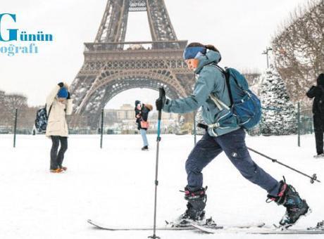 Kar, buz, şiddetli rüzgârlar ve dondurucu soğuk, Avrupa’nın büyük bölümünde seyahat kaosu yaratırken yüzlerce uçuş iptal edildi, yolcular mahsur kaldı. Fotoğrafta, Paris’te Eyfel Kulesi’nin önünde kayak yapan bir kişiyi görüyoruz. LUDOVIC MARIN - AFP