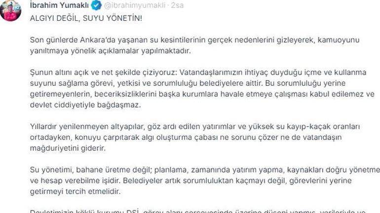 Tarım ve Orman Bakanı İbrahim Yumaklı, sosyal medya hesabından yaptığı açıklamada, vatandaşların ihtiyaç duyduğu içme ve kullanma suyunu sağlama görevi, yetkisi ve sorumluluğunun belediyelere ait olduğunu vurgulayarak, “Beceriksizliği başka kurumlara havale etmek kabul edilemez. Yıllardır yenilenmeyen altyapılar, göz ardı edilen yatırımlar ve yüksek su kayıp-kaçak oranları ortadayken, konuyu çarpıtarak algı oluşturma çabası ne sorunu çözer ne de vatandaşın mağduriyetini giderir. Belediyeler artık sorumluluktan kaçmayı değil, görevlerini yerine getirmeyi tercih etmeli” dedi. Yumaklı, bakanlığına bağlı Devlet Su İşleri Genel Müdürlüğü’nün görev alanı çerçevesinde üzerine düşeni yaptığını bunu verilerle ortaya koyduğunu ifade etti.
