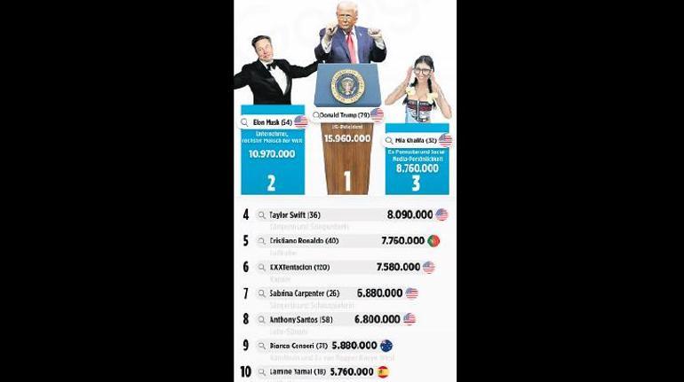 Aylık ortalama 15.9 milyon arama ile ABD Başkanı Donald Trump, dünyanın en çok aranan kişisi oldu, onu 10.97 milyon arama ile Elon Musk takip etti.