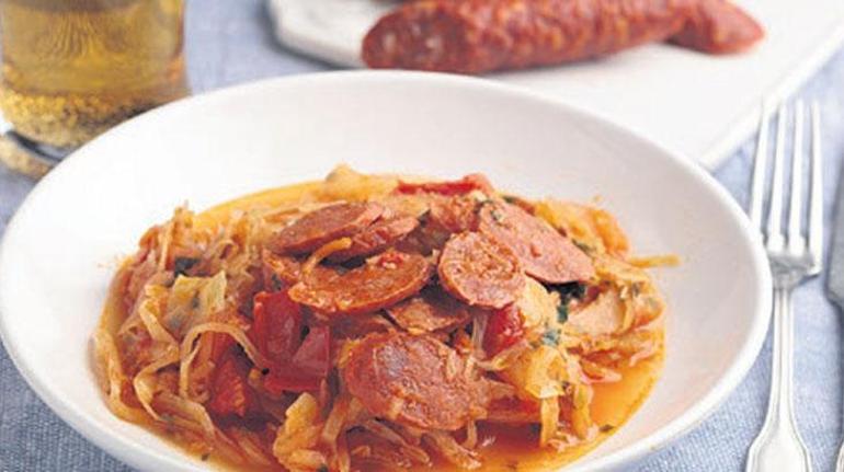 YAPILIŞI: Lahanayı ve köz kırmızı biberi şerit halinde doğrayın. Soğan ve sarımsağı ufak doğrayıp yağda öldürün. Sucuğu soyun, ince dilimleyin, tencereye ekleyin ve kızarıncaya kadar çevirin. Lahanayı ekleyip iyice alt üst edin. Köz kırmızı biberleri ekleyin. Tuzunu biberini ayarlayın. Çok az su ekleyip tencerenin kapağını kapatıp kısık ateşte yumuşayıncaya kadar pişirin. Sarımsaklı yoğurtla servis yapın.