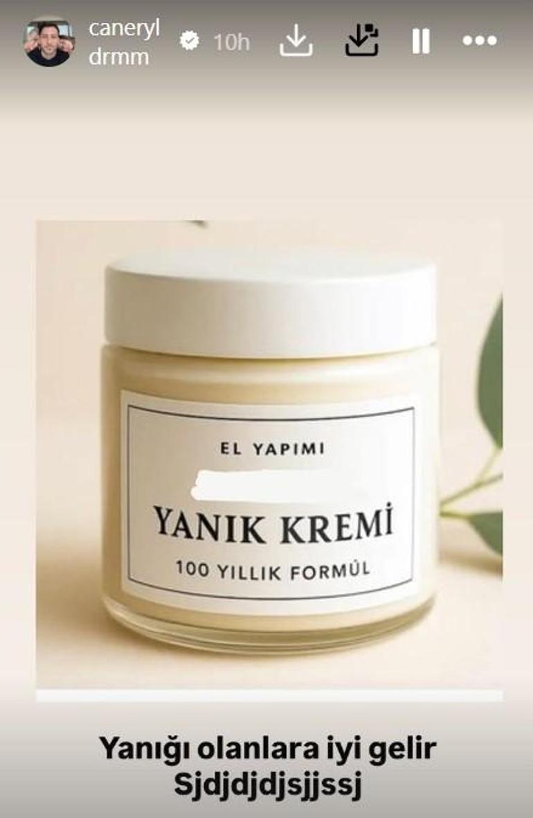 Ünlü ismin eşi daha sonra yaptığı paylaşımda yanık kremi paylaşarak altına: 'Yanığı olanlara iyi gelir' yazdı.
