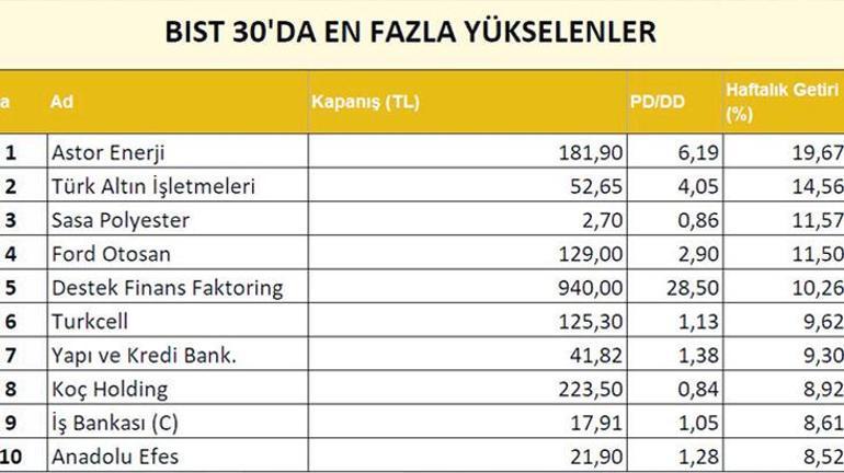 Borsada eğilim en fazla BIST 30 hisselerinde gözlendi. BIST 30 Endeks haftalık bazda yüzde 6.28 yükseldi. Aynı süre içinde 30 hisse içinde yer alan Astor Enerji yüzde 19.67 ile en fazla yükselen hisse oldu. Aralık ayının ilk haftasından bu yana güçlü bir yükseliş eğiliminde olan hisse performansı ile tarihi zirve seviyelerinde yer alıyor. İkinci sırada yer alan Türk Altın İşletmeleri’nin haftalık getirisi ise yüzde 14.56 seviyesinde gerçekleşti. Bu hisse de ekimden bu yana artan ilgiyle birlikte yükseliş eğilimini koruyor.