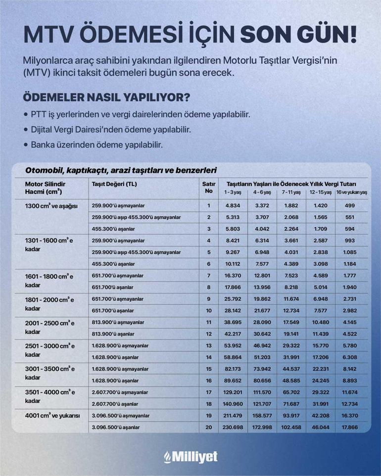 Buna göre, 2025 yılına ilişkin MTV ve 2024'te elde edilen kazançlara yönelik gelir vergisinin ikinci taksitlerinin ödenme süresi bugün sona eriyor.