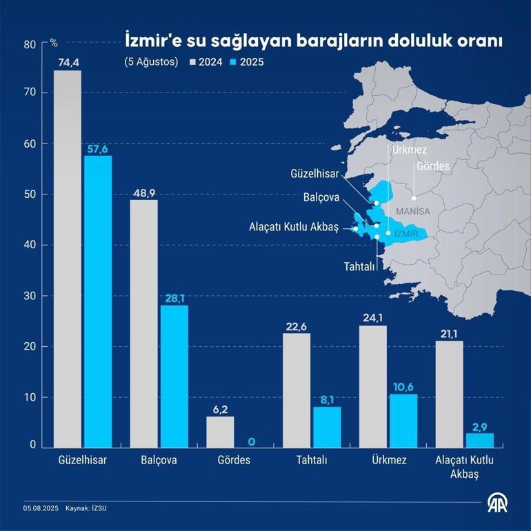 İZSU Genel Müdürlüğü'nden yapılan açıklamada, "Küresel iklim krizi ve yetersiz yağışlar nedeniyle İzmir'in su kaynakları kritik seviyelere gerilemiştir. Yüzeysel kaynaklarımız olan barajlarda rezervler tükenme noktasına gelmiş, yeraltı su kaynaklarında (derinkuyular) ise düşen yeraltı su seviyesi nedeniyle verim ve kapasite azalmıştır. İZSU Genel Müdürlüğü olarak; yeni kuyu açma, mevcut kuyuların rehabilitasyonu, su üretimini artırma ve tasarruf çağrıları gibi pek çok önlem hayata geçirilmiştir. Ancak mevcut koşullar çerçevesinde su tüketiminin kısıtlanması zorunluluk haline gelmiştir. Bu nedenle, 6 Ağustos 2025 itibarıyla İzmir genelinde gece saatlerinde, planlı ve dönüşümlü su kesintilerine başlanacaktır. Su kesintileri, su dağıtım şebekesinin teknik zorunluluklarına göre mahallelerin sadece bir kısmını etkileyebilir. Kesinti tarihleri ve bölgeleri dışında kalan alanlar için ihtiyaç halinde ayrıca duyuru yapılacaktır. İzmir halkının göstereceği anlayış ve dayanışma sayesinde bu zorlu süreci birlikte aşacağımıza inanıyoruz" denildi.