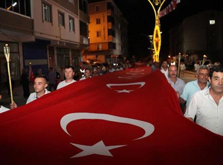 Malazgirt Kaymakamlığı önünde toplanan vatandaşlar, metrelerce uzunluktaki Türk Bayrağı ve meşalelerle yürüyüşe başladı.Jandarma Atlı Birliği, atlı okçuluk ekibi, Ankara Emniyet Müdürlüğünde görevli motosikletli polislerin de yer aldığı yürüyüş, 15 Temmuz Meydanı'nda sona erdi.