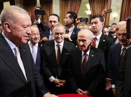 Cumhurbaşkanı Erdoğan, MHP Genel Başkanı Bahçeli'nin ve MHP'li milletvekillerinin bulunduğu, DEM Parti Eş Genel başkanları Bakırhan ve Hatimoğulları ile DEM Parti'li milletvekillerinin olduğu masaları ayrı ayrı ziyaret etti.