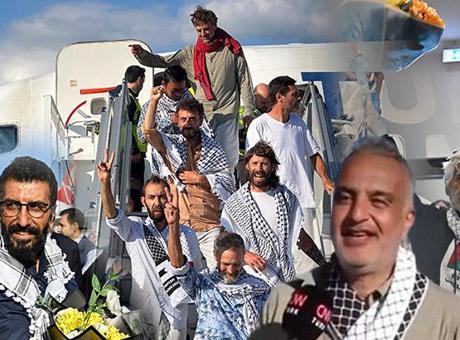 Gazze'deki ablukayını 18 yıl sonra delerek tarihe geçen aktivistler, İsrail'in giydirdiği tek tip kıyafetlerini uçağın içerisinde değiştirdikten sonra "Özgür Filistin" sloganı atarak uçaktan ayrıldı.