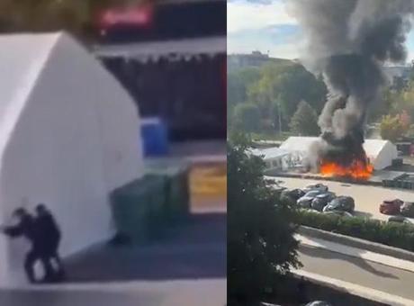 Olay anına ait görüntüler, Sırp kanalı NOVA tarafından paylaşıldı. Görüntülerde, silahlı güvenlik görevlilerinin parlamento önünde kurulan büyük bir çadıra müdahale ettiği, birkaç el silah sesinin ardından çadırda yangın çıktığı görülüyor.
