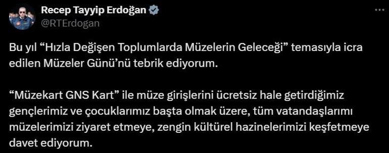 "Bu yıl 'Hızla Değişen Toplumlarda Müzelerin Geleceği' temasıyla icra edilen Müzeler Günü'nü tebrik ediyorum. 'Müzekart GNS' ile müze girişlerini ücretsiz hale getirdiğimiz gençlerimiz ve çocuklarımız başta olmak üzere, tüm vatandaşlarımı müzelerimizi ziyaret etmeye, zengin kültürel hazinelerimizi keşfetmeye davet ediyorum."