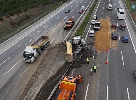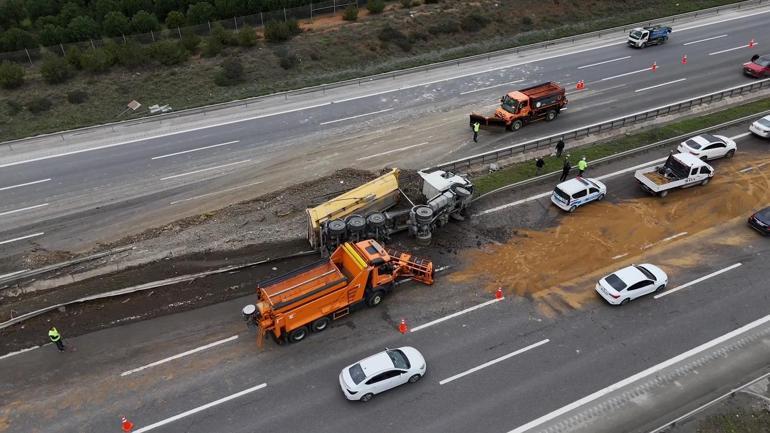 Yola dökülen hafriyat toprağı, iş makineleriyle yapılan çalışmaların ardından temizlenirken, devrilen kamyonun vinç yardımıyla bulunduğu yerden kaldırılacağı bildirildi. Kaza nedeniyle otoyolda bir süre trafik yoğunluğu yaşandı.