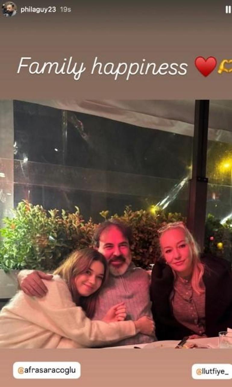 Son olarak ünlü oyuncunun babası Uğur Saraçoğlu, Instagram hikâyesinde “Family Happiness” notuyla eski eşi Lütfiye Hanım ve kızı Afra ile verdiği pozunu yayınladı.