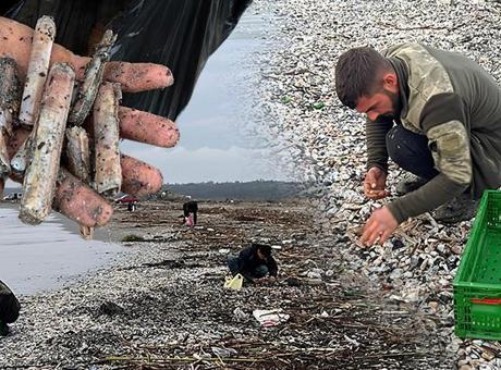 Mersin'de sel ve fırtına sonrası oluşan güçlü dalgalarla birlikte Adanalıoğlu sahilinde binlerce kargı midyesi kıyıya vururken, balıkçılar midyeleri yem yapmak için topladı.
