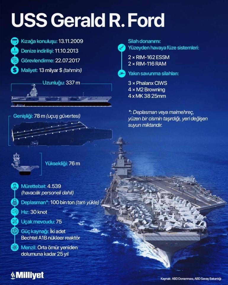 ABD Donanması’na ait USS Gerald R. Ford, pazartesi günü Girit Adası açıklarında görüntülendi. Ford, Orta Doğu’ya gönderilen ikinci uçak gemisi oldu. Böylece aktif durumdaki ABD savaş gemilerinin yaklaşık üçte birinin bölgede konuşlandığı bildirildi.