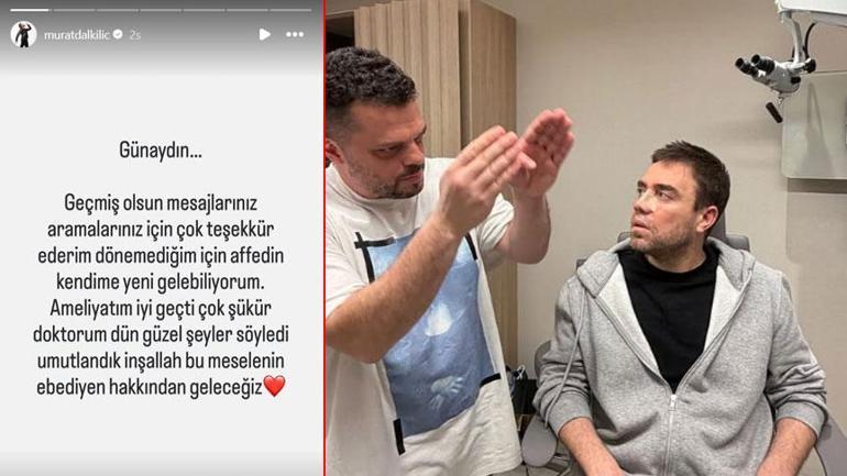 Daha önce 12 kez burnundan operasyon geçiren Murat Dalkılıç, yine ameliyat masasına yattı. Sosyal medya sayfasından açıklama yapan Dalkılıç, "Geçmiş olsun mesajlarınız, aramalarınız için çok teşekkür ederim. Dönemediğim için affedin, kendime yeni gelebiliyorum. Ameliyatım iyi geçti. Çok şükür doktorum dün güzel şeyler söyledi. Umutlandık. İnşallah bu meselenin ebediyen hakkından geleceğiz" dedi.