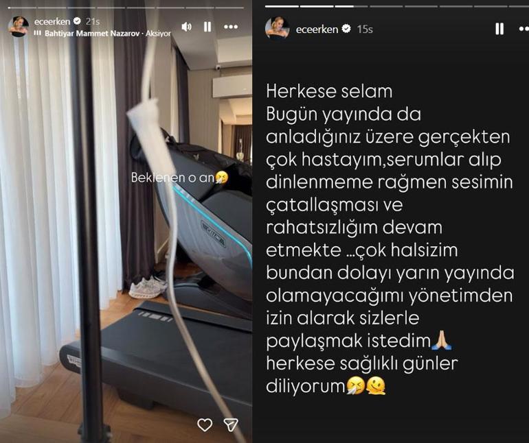 Ece Erken, sosyal medya hesabından yaptığı açıklamada şu ifadeleri kullandı: "Herkese selam bugün yayında da anladığınız üzere gerçekten çok hastayım. Serumlar alıp dinlenmeme rağmen sesimin çatallaşması ve rahatsızlığım devam etmekte. Bundan dolayı yayında olamayacağım yönetimden izin alarak sizlerle paylaşmak istedim. Herkese sağlıklı günler diliyorum."