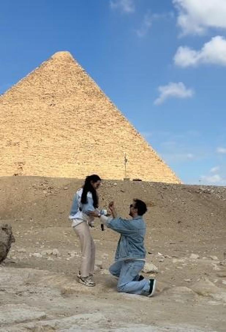 Çift, piramitleri ziyaret ettikleri sırada romantik anlar yaşadı. Doğaç Yıldız, devasa piramitlerin önünde bir anda sevgilisinin önünde diz çökerek evlenme teklifinde bulundu.