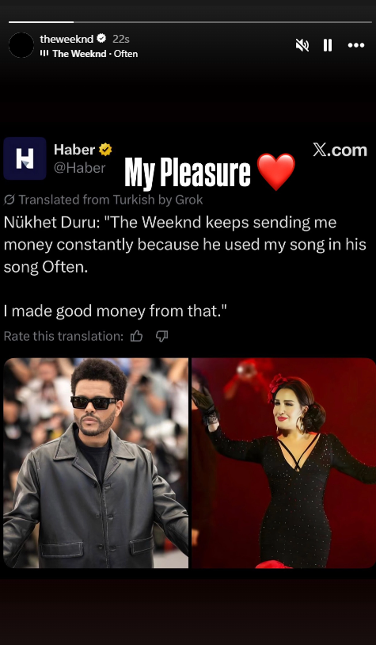 Nükhet Duru'nun bu sözlerine The Weeknd'ten yanıt geldi. Dünyaca ünlü şarkıcı Duru'nun sözlerini sosyal medya hesabından paylaşarak "Benim için zevkti" notunu düştü.