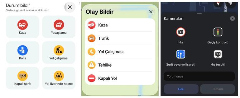Google Maps'te yolculuk esnasında “Durum bildir” seçeneğine tıkladığınızda karşınıza altı seçenek çıkıyor. Bunlardan biri “Polis” seçeneği. Yaklaşık 500 metre ilerinizde bir polis olup olmadığını buradan bildirebiliyor, yolda önünüze çıkan “Hala yakında polis var mı” seçeneğine verdiğiniz cevapla siz de topluluk bildirimlerine katılabiliyorsunuz. Öte yandan Temmuz 2024'te bildirimler arasına sürücülere hız radarlarının yerini gösteren “Hız Tuzağı” adlı seçeneği Türkiye'deki kullanıcılarına açan Google, Aralık 2024'te bu uygulamaya son verip, bildirimi “Polis” şeklinde değiştirme kararı almıştı.