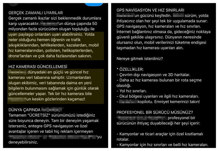 Az önce söz ettiğimiz ve en önemli özelliği olarak radar tespitini gösteren uygulamanın tanıtım sayfasındaki iddiası ise “... dünyadaki en güçlü ve güncel hız kamerası veri tabanına sahiptir. Uzmanlardan oluşan ekibimiz, veri tabanında daima en yeni bilgilerin bulunmasını sağlamak için günlük olarak güncellemeler yapar. Tek bir hız kamerası bile ...'un keskin gözlerinden kaçamaz” şeklinde. Aynı zamanda tanıtımda yer alan “Yolda neler olduğunu hemen öğrenin ve trafik sıkışıklıklarından, tehlikelerden, kazalardan, mobil hız kameralarından, polisten, helikopterlerden, drone'lardan ve çok daha fazlasından sakının” ifadeleri de dikkat çekici.