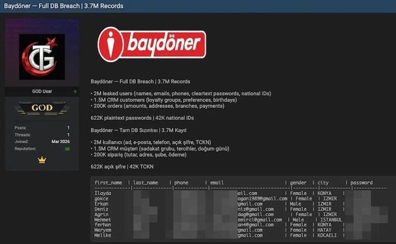 HABER MERKEZİ -Türkiye’de yaygın şubeleri bulunan restoran zinciri Baydöner, büyük çaplı bir veri ihlaliyle gündeme geldi. Siber suç forumlarında paylaşılan bilgilere göre şirketin veri tabanı ele geçirilmiş durumda ve yaklaşık 3.7 milyon kayıt içeren bir verinin ele geçirildiği iddia ediliyor.