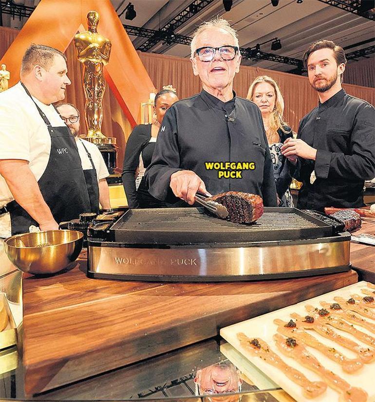 Partide bin 500 kişilik yiyecek tam 325 kişilik bir servis ekibi tarafından sunulacak. Mutfak ekibinde ise 75 şefin yanı sıra 45 tatlı ve pasta şefi var. Menü ağırlıklı olarak ‘comfort food’ olarak adlandırılan herkesin sevdiği pizza, hamburger gibi lezzetlere ağırlık veriyor. Ama hepsi en pahalı malzemeyle donatılmış. Wolfgang Puck klasik imza yemeği olan somonlu pizza kraker olarak Oscar heykelciği şeklinde hazırlanıyor. Mini hamburgerler havyarlı ve trüf mantarlı sunuluyor. Bunun için masraftan kaçınılmamış. Malzeme listesinde 136 kilo ev yapımı füme somon ve en kıymetlisinden 14 kilo Kaluga havyarı dikkati çekiyor. Ancak listedeki en göz alıcı malzeme likit altın. Altın Oscar heykelciklerinin dağıtılacağı gecede çikolata büfesinde kullanılmak üzere tam 7 buçuk litre 24 ayar sıvı altın ısmarlanmış.