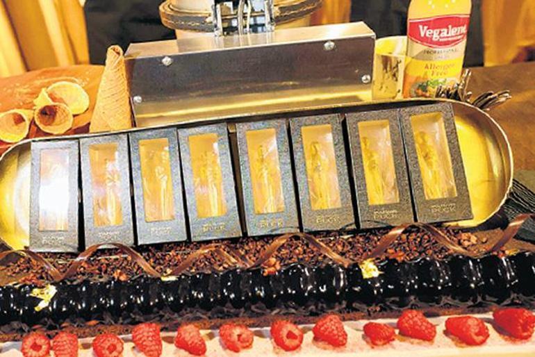 Çikolatadan yapılmış mini Oscar heykelcikleri altın tozuyla ışıldamış bir şekilde konukları bekliyor.