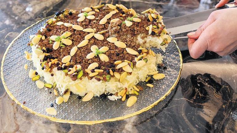 Yapılışı: Kırık pirinci birkaç kez yıkayıp kısa süre dinlendirin. Kuş üzümlerini ılık suda bekletip süzün ve kurulayın. Bir tavada ince doğranmış soğanı zeytinyağında kavurun. Kıymayı ekleyip suyunu çekene kadar pişirin. Karabiber, yenibahar ve tuz ekleyerek iç harcı hazırlayın. Ayrı bir tavada bademleri hafifçe kavurun. Dolmalık fıstık, Antep fıstığı ve kuş üzümlerini ekleyip birkaç dakika daha çevirin. Pilav için tereyağını eritip kırık pirinci kısa süre kavurun. Üzerine sıcak su ve tuz ekleyerek pilavı tane tane pişirin. Kek kalıbının tabanına önce kuruyemişli karışımı yerleştirin. Üzerine kıymalı harcı yayın, en üste pilavı bastırarak ekleyin. Birkaç dakika dinlendirdikten sonra servis tabağına ters çevirin.
