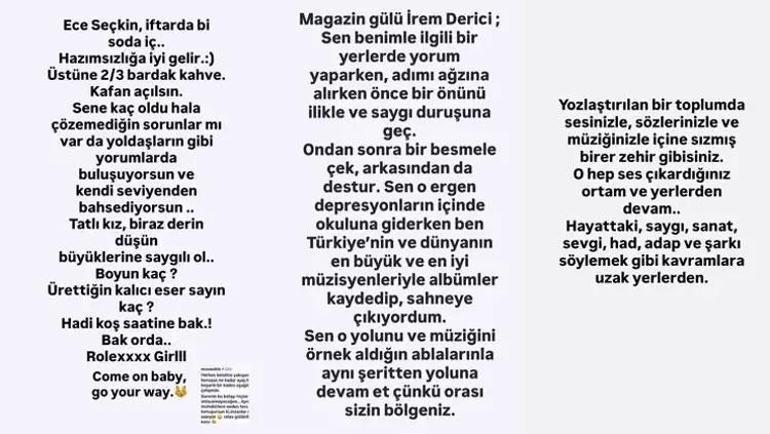Burcu Güneş'in bu sözlerine karşılıksız kalmayan İrem Derici, sosyal medya hesabından yaptığı paylaşımda Ece Seçkin'i koruyarak şunları söyledi: "Kız sana ne oldu, yıllardır yerinde saydın, o sizin bölgeniz dediğin yere girmek için yırtıldın, Quincy Jones' la albüm kaydetti sanki açıklamaya bak önümü iliklemiyorum, bir düğme daha açıyorum hatta. Nasıl bir ruh hastası olduğunu tüm sektör biliyor, besmele çek diyor karı kendini Sezen Aksu sandı. Aciz."